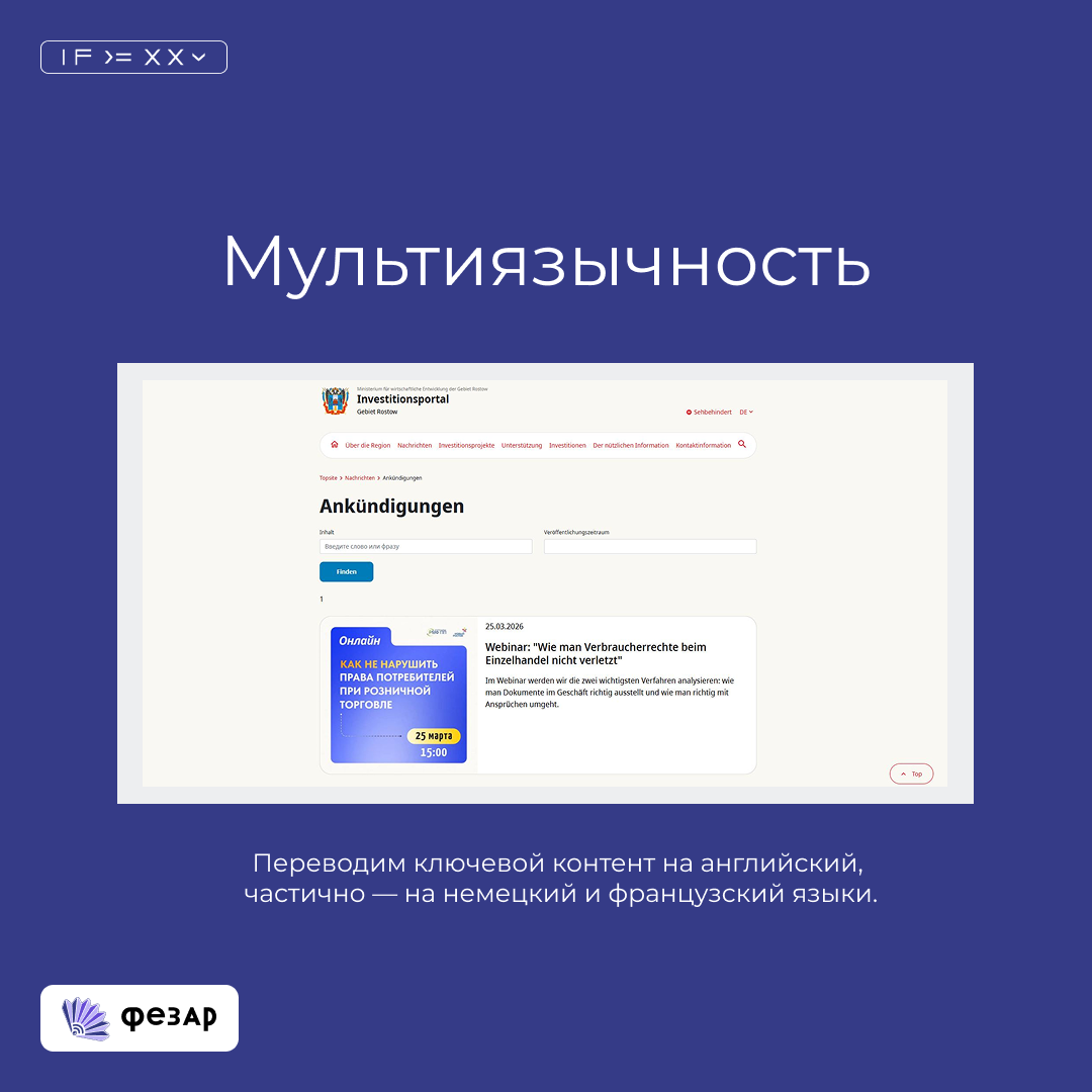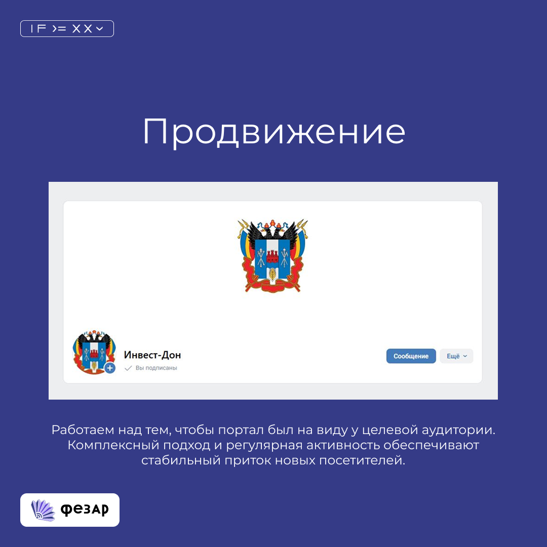 С 2013 года сопровождаем и развиваем invest-don.ru — портал об инвестиционной деятельности Ростовской области для министерства экономического развития региона. И не просто поддерживаем, а делаем так, чтобы портал оставался живым, актуальным и полезным для инвесторов со всего мира.