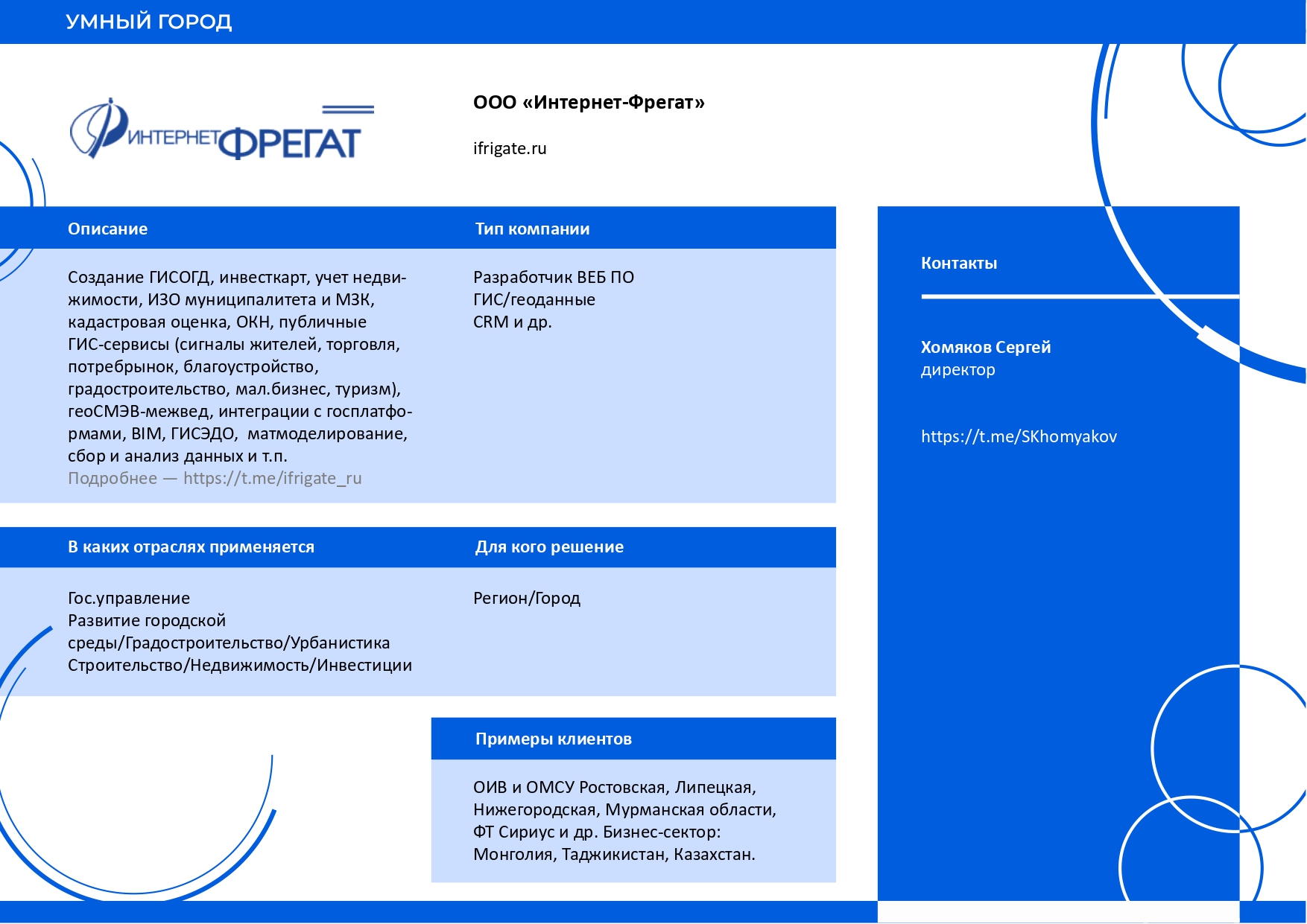 Компания «Интернет-Фрегат» с 2003 года входит в ассоциацию РУССОФТ. На протяжении многих лет мы создаём решения для городов: ГИСОГД (государственные системы градостроительной деятельности), инвестиционные карты, учёт и инвентаризацию недвижимости, единые кадастровые реестры, сервисы для объектов культурного наследия, интеграции с госплатформами и СМЭВ, публичные геосервисы, BIM-моделирование, ГИС-документооборот и аналитические инструменты. Благодаря такому опыту создание Карты решений для Умного города невозможно представить без нашего участия.
